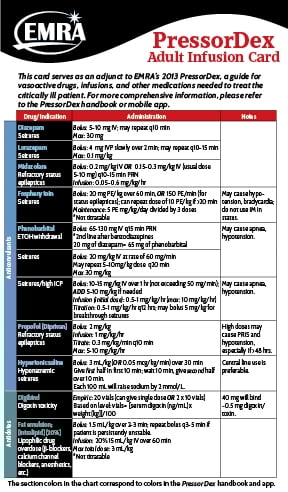 This indispensable tri-fold clinical card serves as an adjunct to EMRA's popular PressorDex®. This color-coded pocket reference includes pertinent sections on anticonvulsants, antidotes, antiplatelets/anticoagulants, thrombolytics, inotropes, pressors, antihypertensives, sedation, analgesia, and much more.