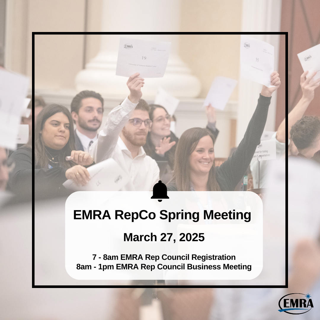 The Policy Review committee meets between the fall and spring meetings largely through email. This committee is composed of your Council Officers, the EMRA President and Immediate Past President, the Legislative Advisor, and two program representatives. The committee is appointed sixty days prior to the fall Representative Council meeting. If you are interested in serving, please email EMRA Staff with your curriculum vitae by the deadline.