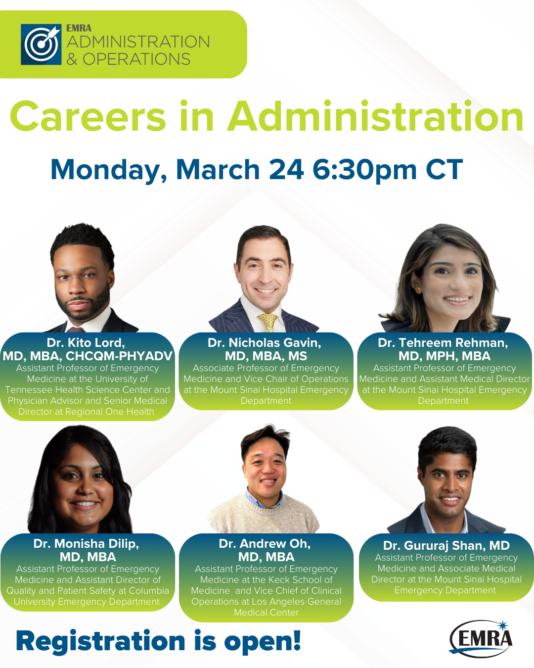 Join our Zoom panel where experienced emergency medicine administration fellowship graduates share their unique journeys. In this interactive session, panelists will discuss the training process, the challenges they faced, and the rewarding career paths available in healthcare leadership and administration. Whether you're a prospective resident, fellow or a current practitioner, this event offers valuable insights, practical guidance, and networking opportunities to help you navigate and advance your career in emergency medicine administration.