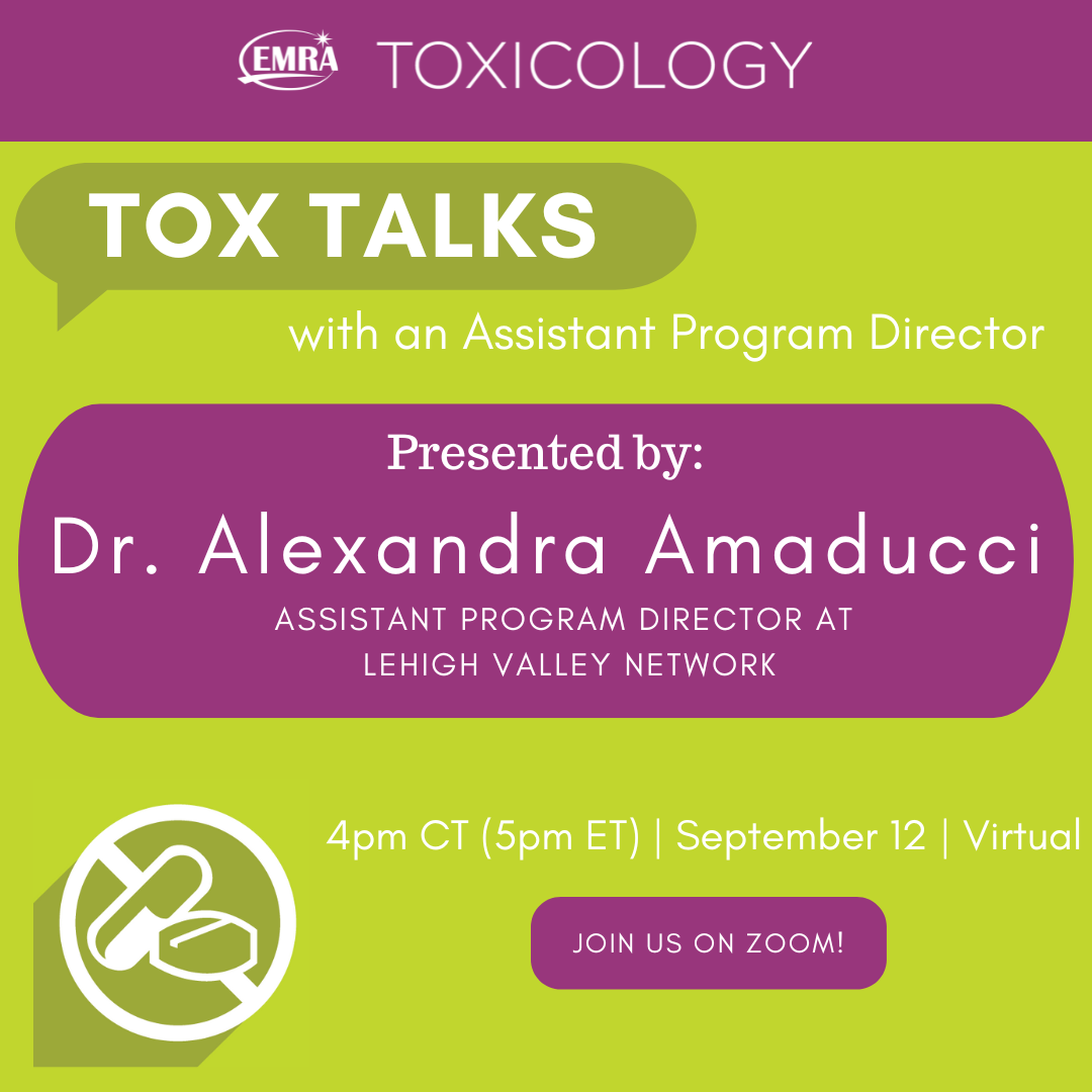 Hey everyone! Mark your calendars for an exciting event with EMRA Toxicology on April 7th at 8 PM EST / 7 PM CST, featuring Dr. Kenneth Katz. He’ll be sharing his experiences as a toxicologist and emergency medicine physician, highlighting some of his experiences in patient advocacy. Don’t miss this opportunity to be inspired to get involved in advocacy efforts. Hope to see you there!