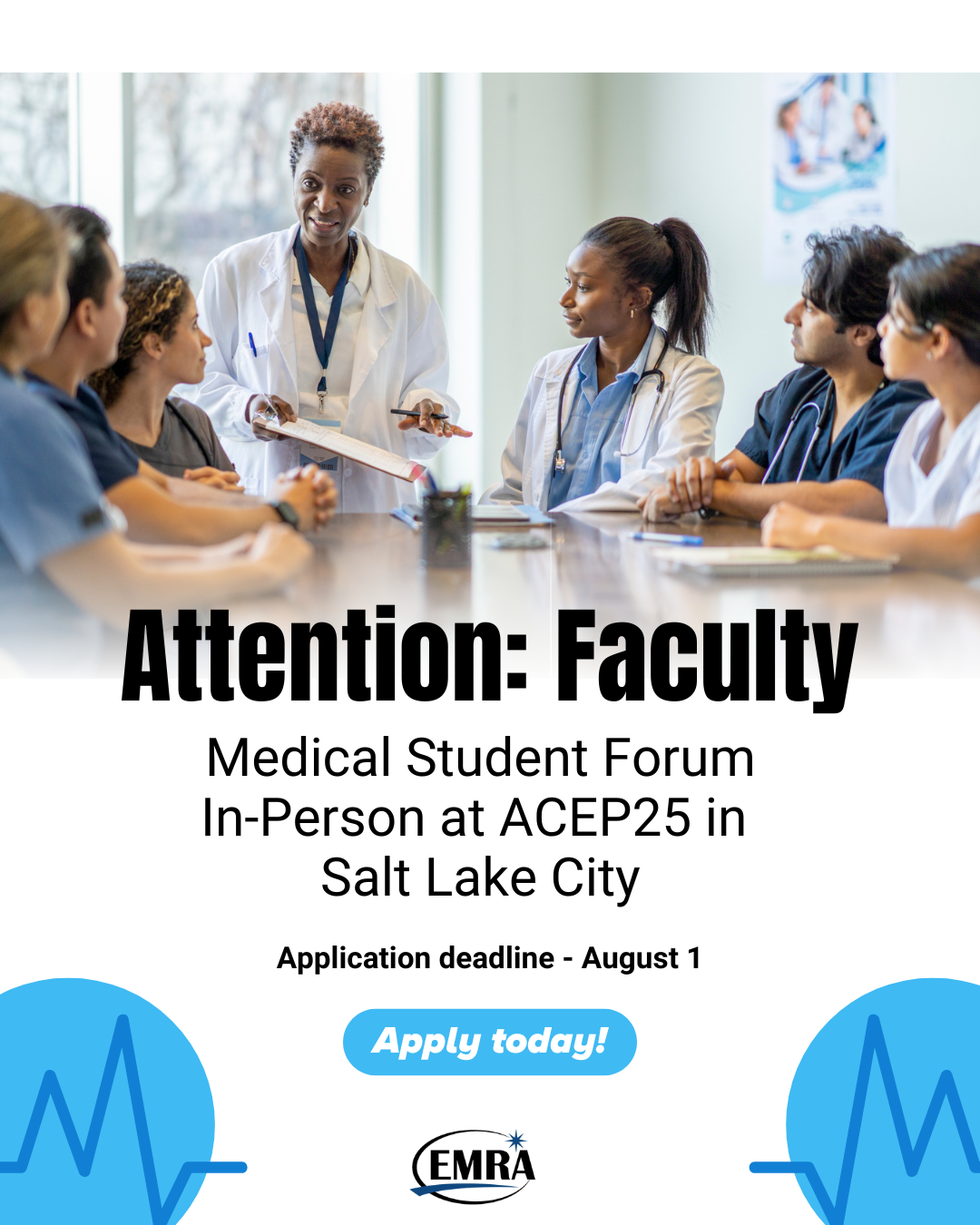 ATTENTION FACULTY - Interested in speaking in person at ACEP's Scientific Assembly 2025 in Salt Lake City at EMRA's Fall Medical Student Forum? The application deadline is August 1 - don't delay; apply today! The MSF brings together program directors and faculty to answer questions from medical students in each of the phases of their journey. General sessions answer big-picture topics, and breakout sessions by year allow for a more intimate and targeted discussion with experienced EM docs.