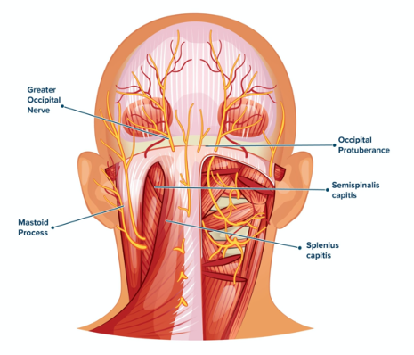 This is the approximate location of the greater occipital nerve as it extends up from its exit from the semispinalis capitis muscle at approximately the C1/C2 position (*GON often noted as the point of maximal tenderness).