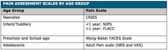 - <1 year: Neonatal Infant Pain Scale (NIPS)