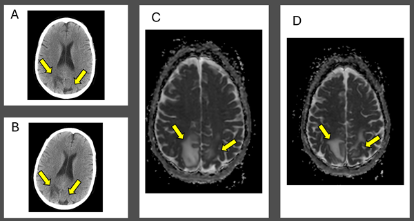 Figure 1: Computed Tomography and Magnetic Resonance Imaging Demonstrating Posterior Reversible Encephalopathy Syndrome (PRES) Figure Caption: Initial (A) and next-day (B) CT imaging of concerning for PRES, with bilateral parietal vasogenic edema noted. MRI demonstrated expansile T2/FLAIR hyperintense signal in the posterior frontal and parietal lobes, favored to be PRES (C and D). Arrows correspond to areas of interest.