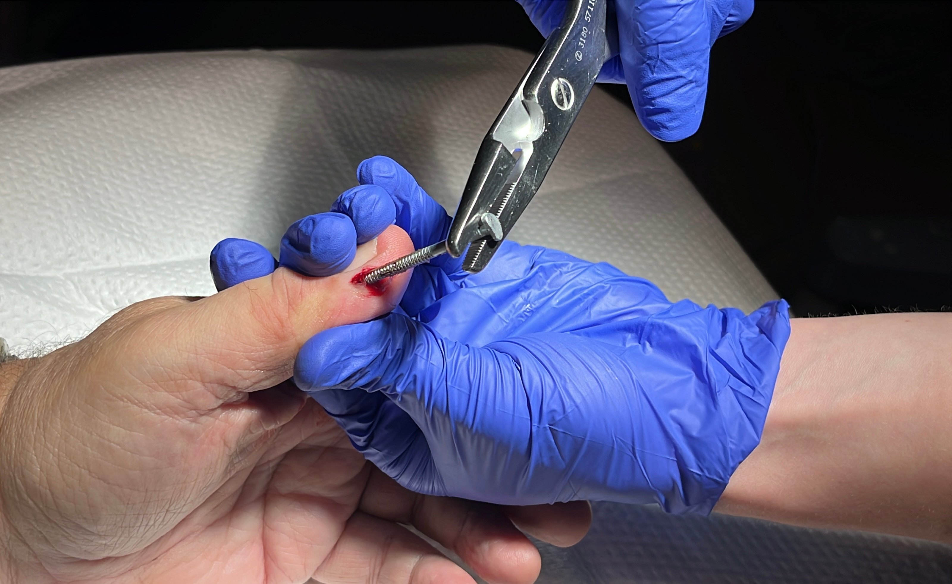 Management of hand injuries due to nail guns further includes pain management, ensuring a Tetanus vaccination update if indicated and administering antibiotics, preferably with anti-staphylococcal and anti-pseudomonal coverage, both in the ED prophetically with the patient and continued outpatient.7,8 The case discussed here, similar to a previous study of hand injuries, presents an efficient method of extraction of a threaded screw in a patient digit with bony involvement that offers successful patient outcomes while efficiently avoiding extensive resources, including that of operating room costs, equipment, staffing, resources and patient cost and time.9