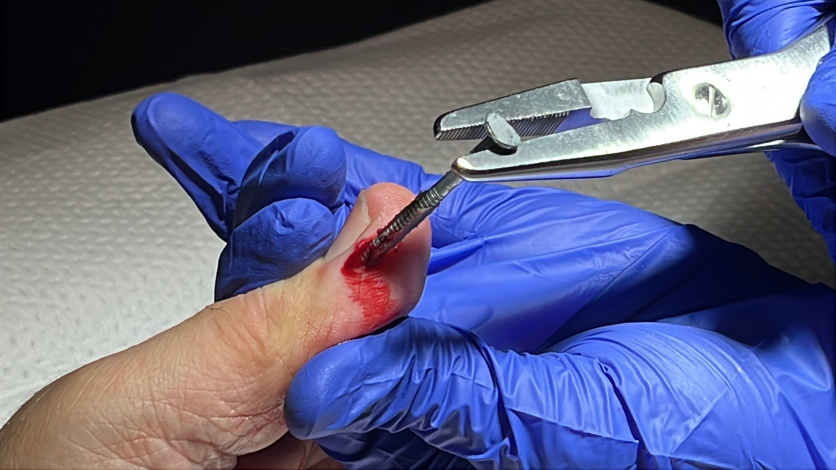 The management of removal of foreign objects from the extremities and phalanges is essential in emergency medicine management; in particular, understanding of the mechanism of injury and details about the object impaled is important. In this case, fasteners such as nails and screws vary between driven-in with a hammered or direct force of motion, versus a rotational force, which is often used with screws. The metal nail described in this case was one with a spiral thread on the shank, beneficial for home renovation projects as it creates a thread-like interlock and increasing withdrawal capacity.1 Further, penetrating nail gun and screw injuries to the hand commonly occur in both professional and nonprofessional settings, where 14% of nail gun injuries that occur at home involve a hand or finger trauma.2