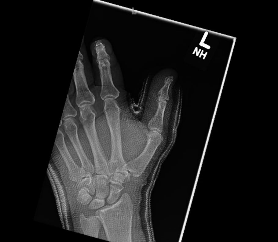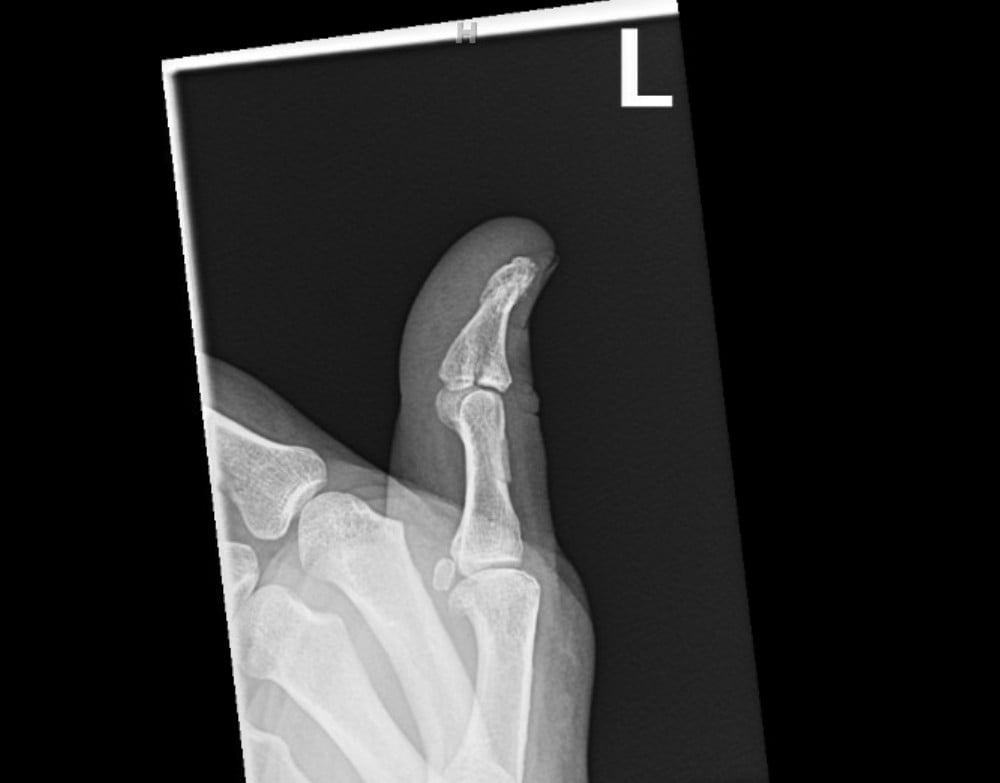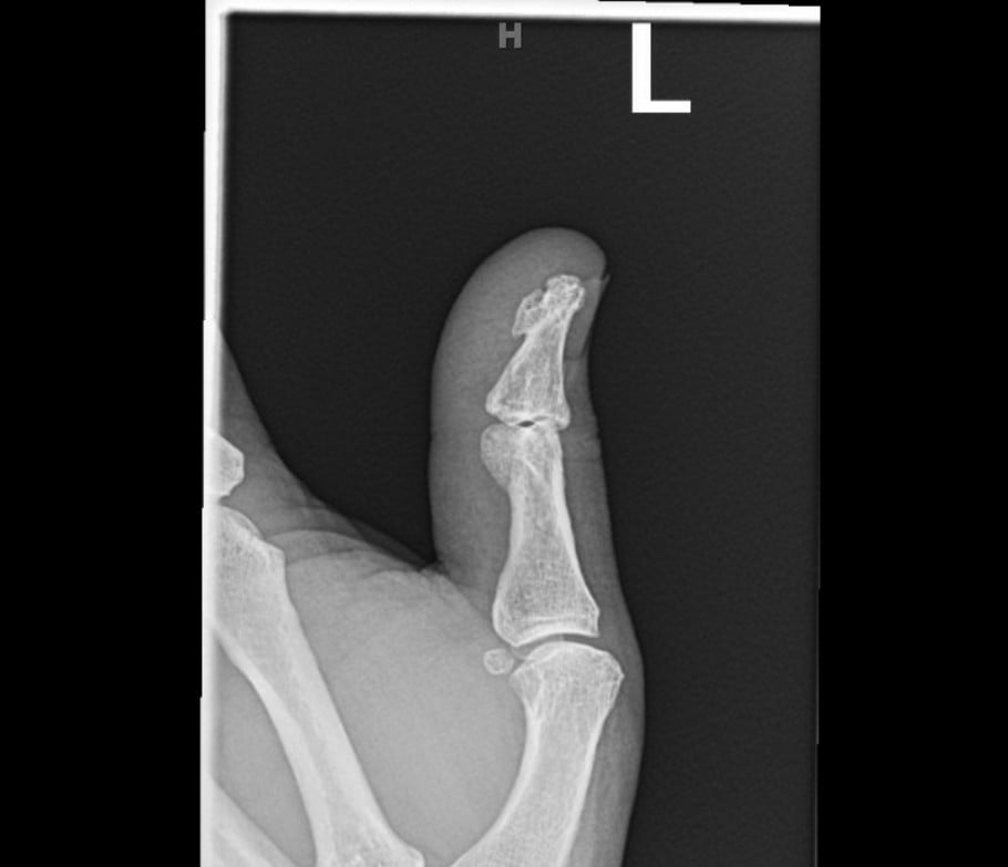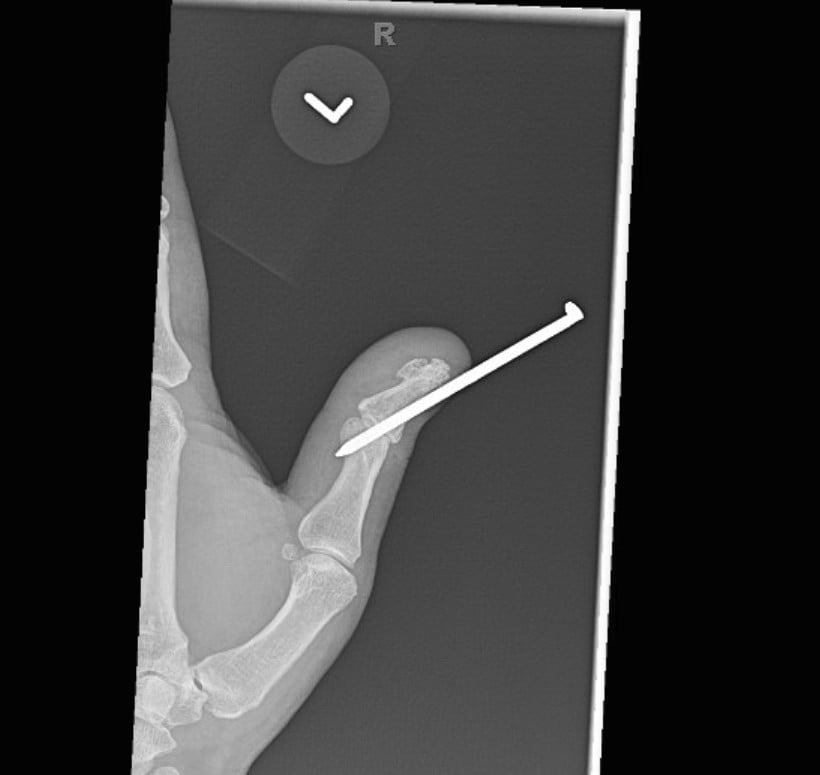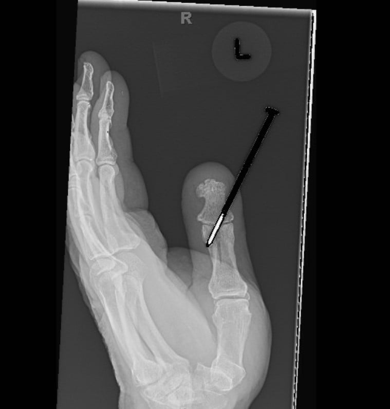 Radiographs were obtained including anterior-posterior and lateral views of the left thumb which demonstrated a penetrating injury of a metallic object (in this case, the threaded nail). The nail on X-ray did appear to pierce the base of the distal phalanx with extension through the interphalangeal joint into the thumb proximal phalanx with an associated vertically oriented split fracture of the proximal phalanx, evident with increased radiolucency on these films. No gas within the soft tissues or other identified foreign bodies; fractures, dislocation, or other acute bony abnormalities were noted. The hospital site has an orthopedic surgery residency program, and the orthopedic surgery resident was consulted given the bony involvement and the recommended outpatient management with an orthopedic hand surgeon.
