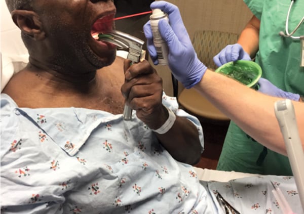 Prior to ultrasounding the suspicious area it is essential to obtain local anesthesia, especially in patients with a strong gag reflex. This may be performed through topical gel lidocaine, nebulized lidocaine, benzocaine spray, or injected anesthetics. We recommend topical benzocaine spray due to ease of provider use and patient comfort. To avoid aspiration, have the patient sitting up in the bed with suction and a spit basin available. To improve visualization of the posterior pharynx the provider may utilize a tongue depressor or ideally a Macintosh blade inserted to the base of the tongue while the patient holds the handle for improved control and light access.