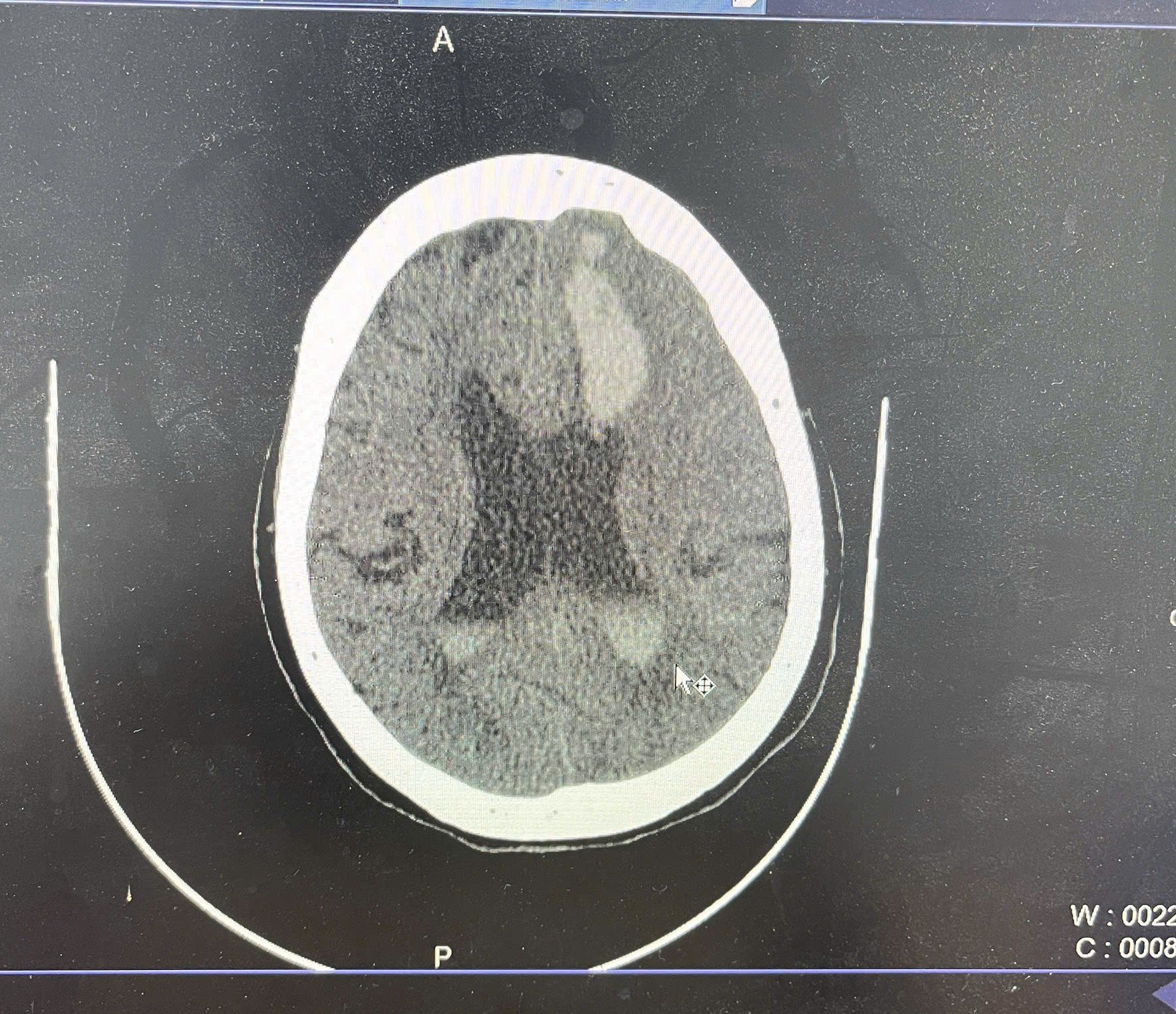 An elderly female patient presented with high-grade fever, altered mental status, bilateral pulmonary crackles, and agonal breathing—a clinical scenario that may initially lead physicians to suspect respiratory infection or meningitis. However, an emergent non-contrast head CT subsequently revealed a large hemorrhage in the left basal ganglia extending into the lateral and third ventricles, accompanied by cerebral edema and midline shift. Although the CT scan was performed immediately after endotracheal intubation, the imaging had not yet been formally interpreted when the patient experienced sudden cardiac arrest during transport back to the emergency department.