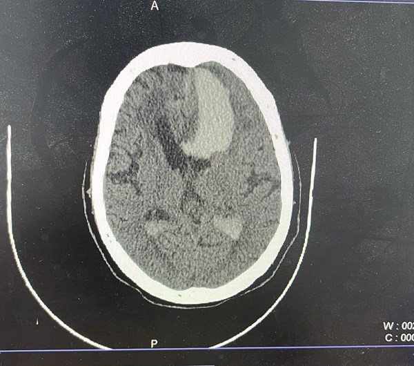 Figure 2. Non-contrast axial CT image at a higher level shows hyperdense hemorrhage in the left periventricular white matter and left lateral ventricle, consistent with intraparenchymal hemorrhage and intraventricular extension. There is surrounding hypodensity representing cerebral edema and rightward midline shift indicating mass effect.