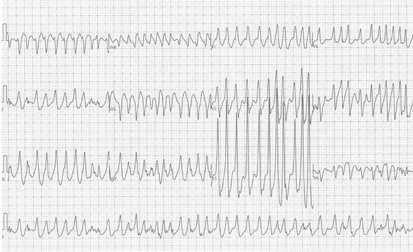 There is a concern for atrial fibrillation (AF) with pre-excitation from an accessory pathway. Defibrillation pads are placed on the patient, and the decision is made to electrically cardiovert. A post-cardioversion ECG confirms the suspected diagnosis of AF with Wolff-Parkinson-White (WPW) (Figure 2).