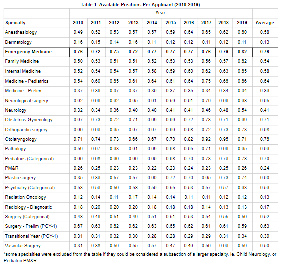 Using the “available positions per applicant” ratio, where does EM rank among the specialties? Let’s look at the numbers.