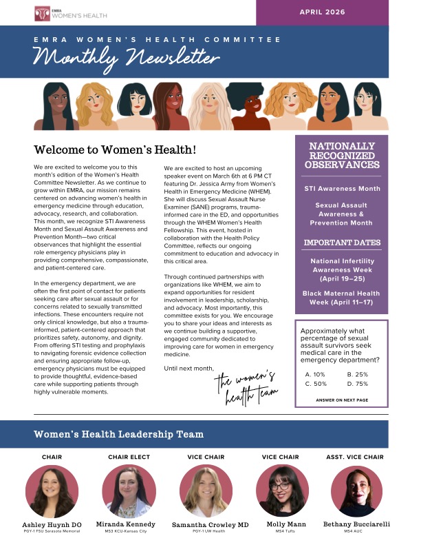 Our newsletter celebrates the accomplishments of women in the field, shares insights on professional development and wellness, and highlights ongoing efforts to address gender disparities in emergency medicine. Together, we’re building a stronger, more connected community that champions collaboration, mentorship, and advocacy for the future of our profession.